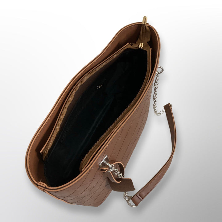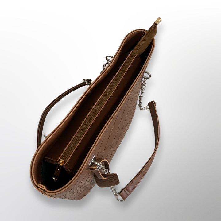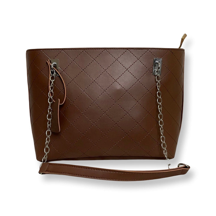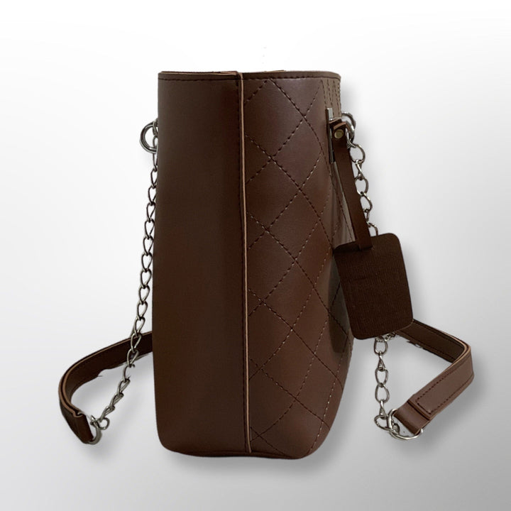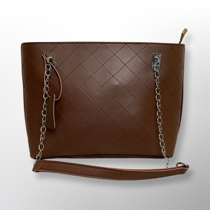Discover sophistication with this classic shoulder tote bag, beautifully crafted from high-quality vegan leather for the eco-conscious fashionista. The checkered design adds a timeless elegance, while the sleek contours ensure a modern silhouette. Adorned with two shoulder straps that boast chic chain details, this bag marries functionality with high-end style. Inside, a spacious zippered compartment offers ample room for your essentials, complemented by an additional internal pocket with its own zipper, perfect for securing smaller treasures. Whether you're heading to the office or out for an evening, this tote bag is the epitome of style without compromise.