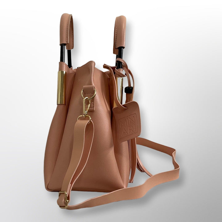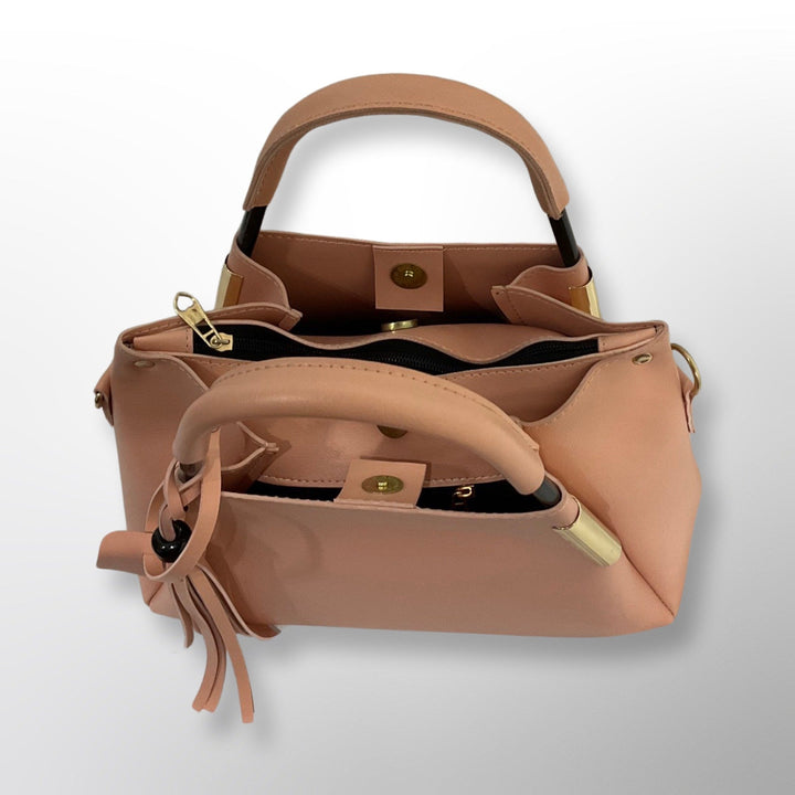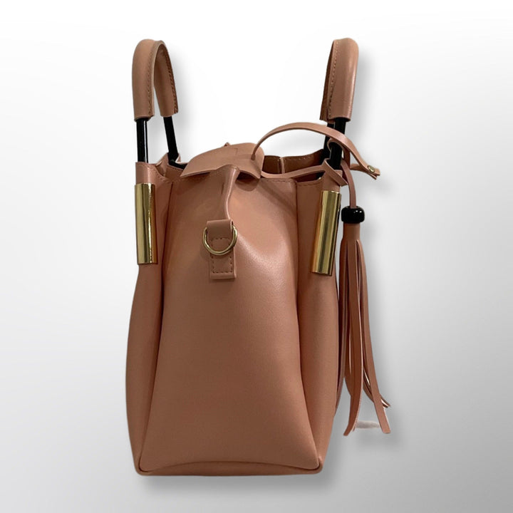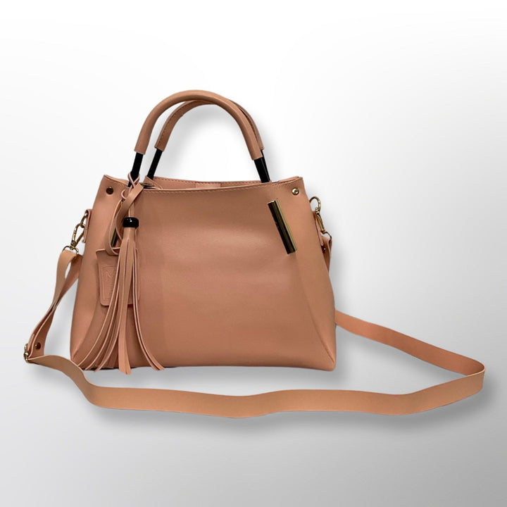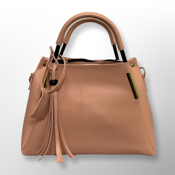 This chic women's shoulder handbag, made from premium vegan leather, elegantly combines style with practicality. Boasting a spacious design, it includes two sturdy metal handles, a detachable long shoulder strap for versatility, and a secure internal zipper pocket. Accented with a playful tassel and a custom leather brand label, this handbag ensures a sophisticated look for any occasion.