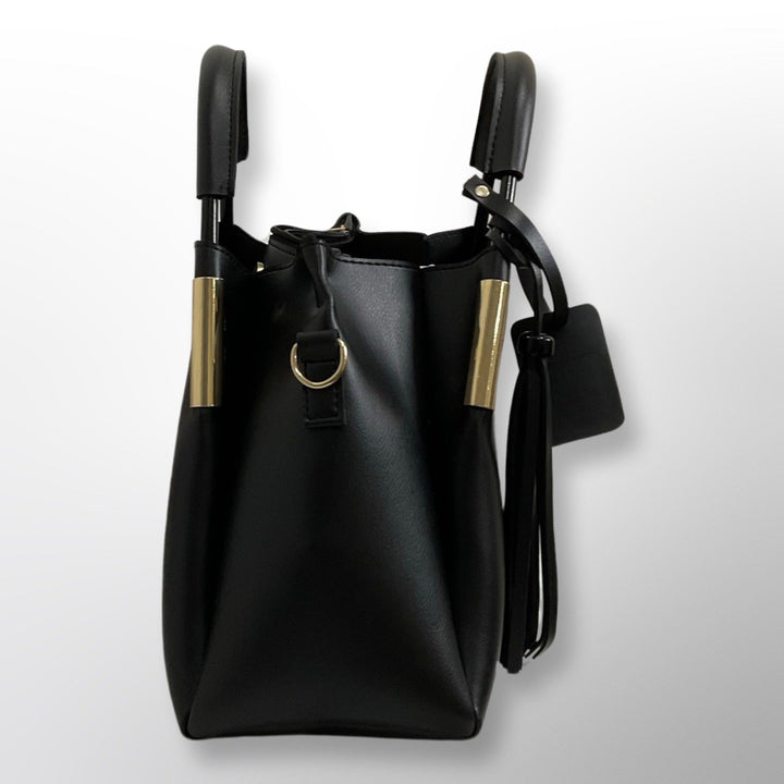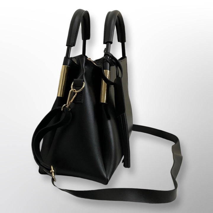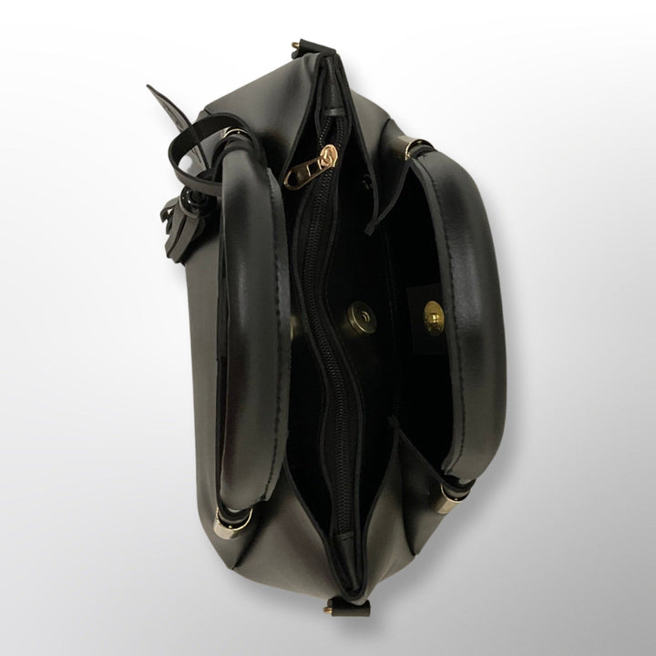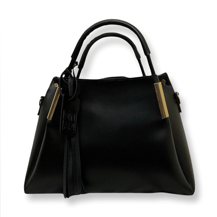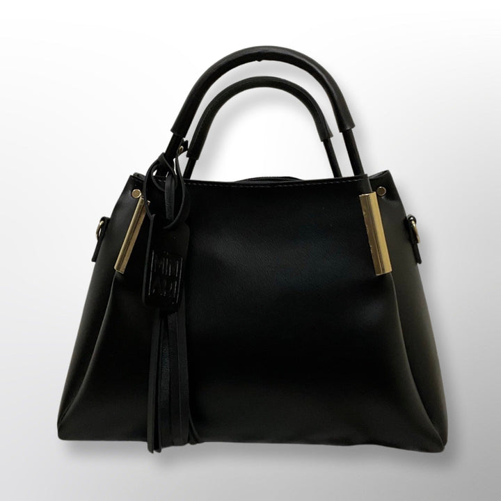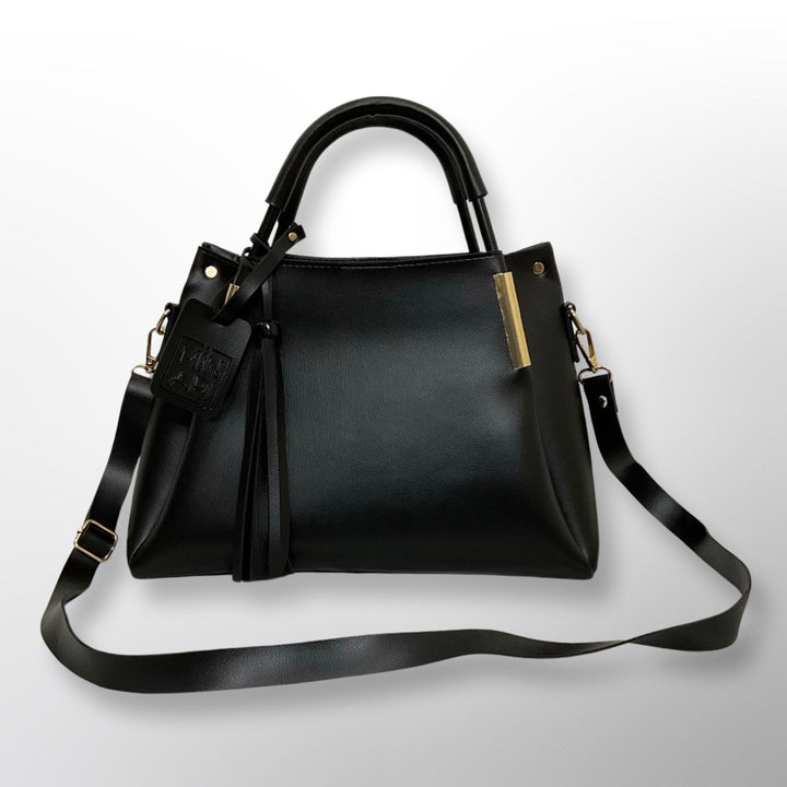 This chic women's shoulder handbag, made from premium vegan leather, elegantly combines style with practicality. Boasting a spacious design, it includes two sturdy metal handles, a detachable long shoulder strap for versatility, and a secure internal zipper pocket. Accented with a playful tassel and a custom leather brand label, this handbag ensures a sophisticated look for any occasion.