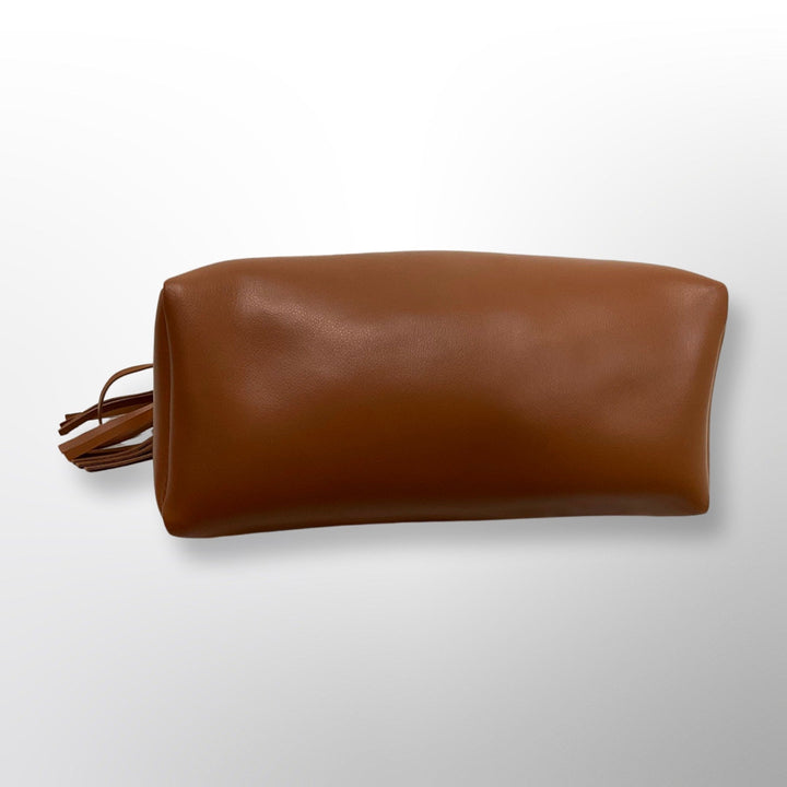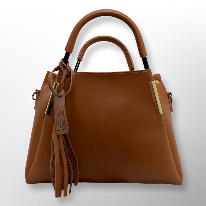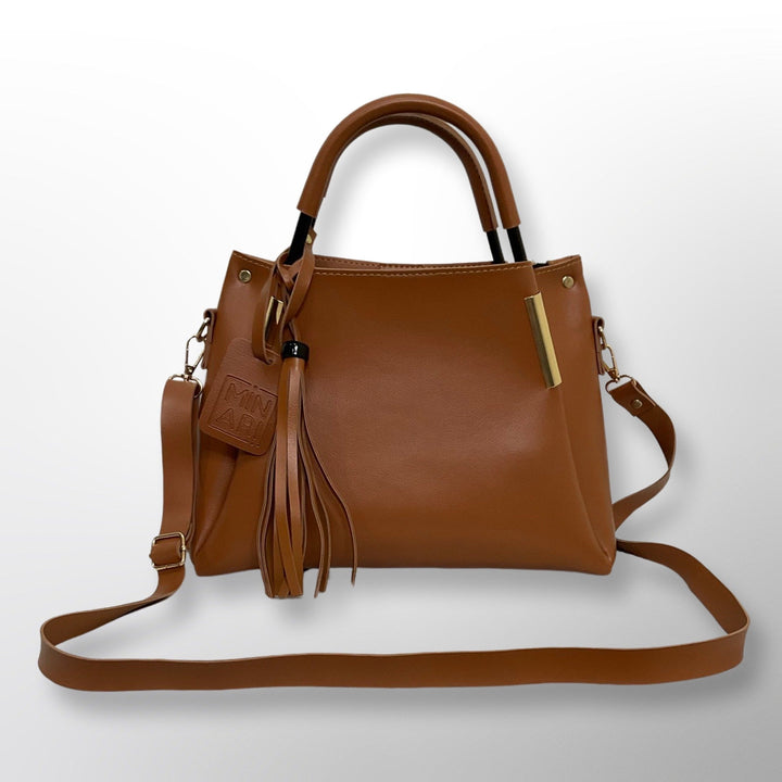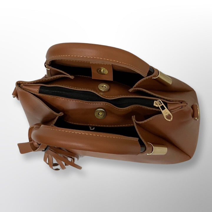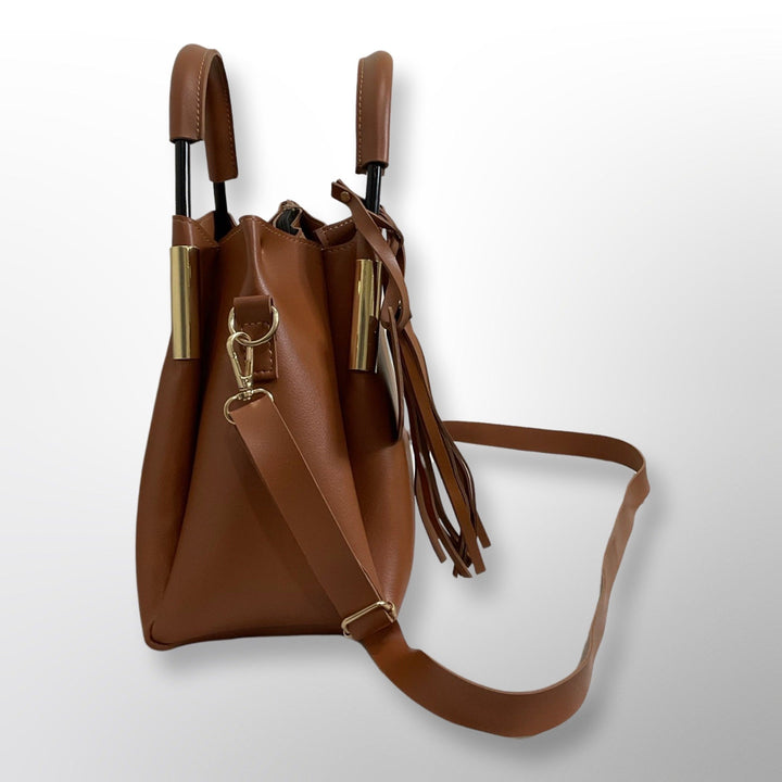 This chic women's shoulder handbag, made from premium vegan leather, elegantly combines style with practicality. Boasting a spacious design, it includes two sturdy metal handles, a detachable long shoulder strap for versatility, and a secure internal zipper pocket. Accented with a playful tassel and a custom leather brand label, this handbag ensures a sophisticated look for any occasion.