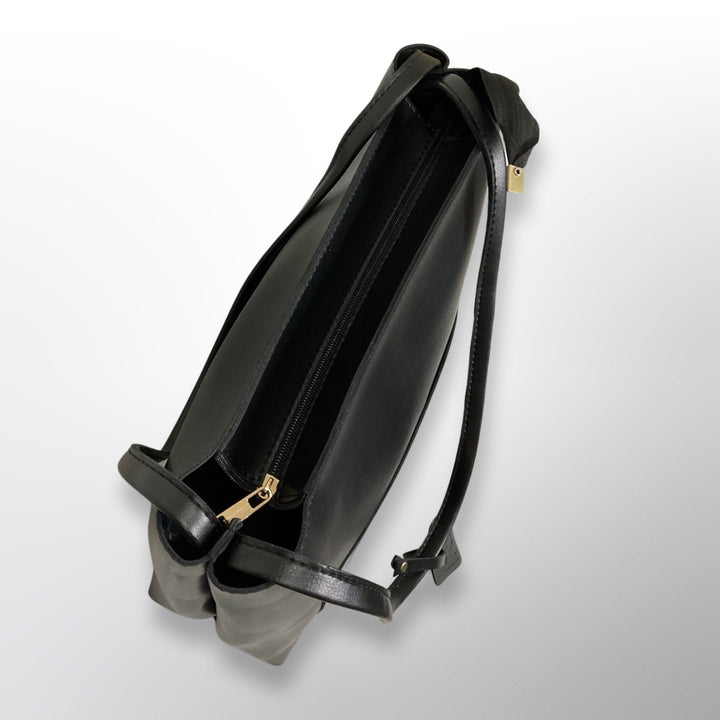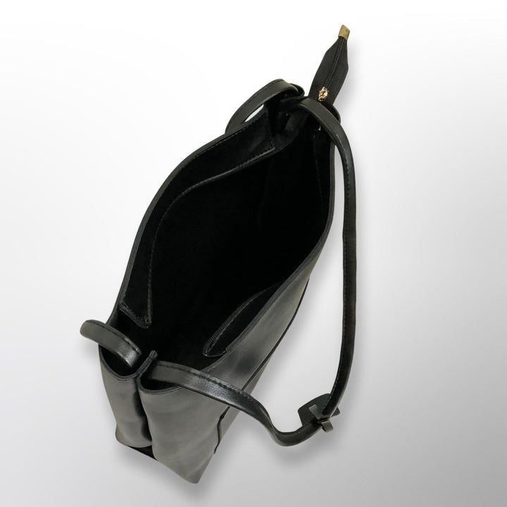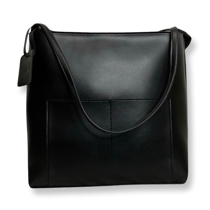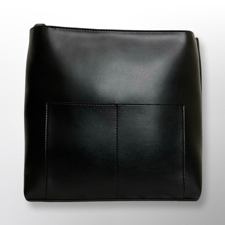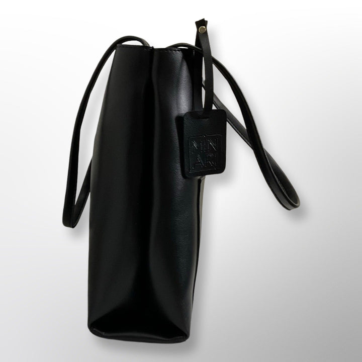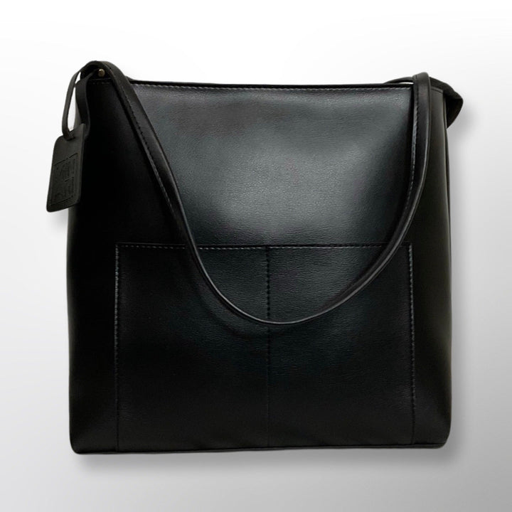 Elevate your everyday style with this sleek shoulder tote bag, a testament to eco-conscious fashion made from sumptuous vegan leather. Designed for the modern woman, it features two comfortable shoulder straps for easy carrying. Stay organized on the go with two external smart pockets, perfectly sized for your mobile phone and essentials. The interior reveals a spacious zippered compartment, keeping your belongings secure and accessible. This tote's minimalist design is both practical and chic, making it an impeccable addition to any ensemble.